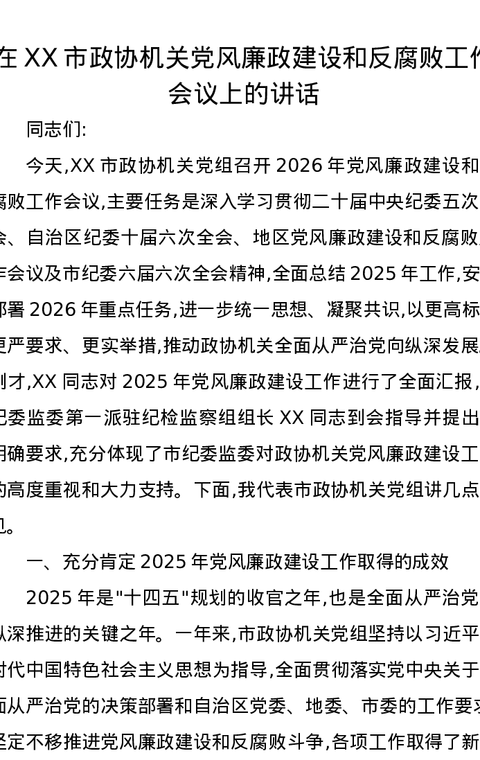 在XX市政协机关党风廉政建设和反腐败工作会议上的讲话