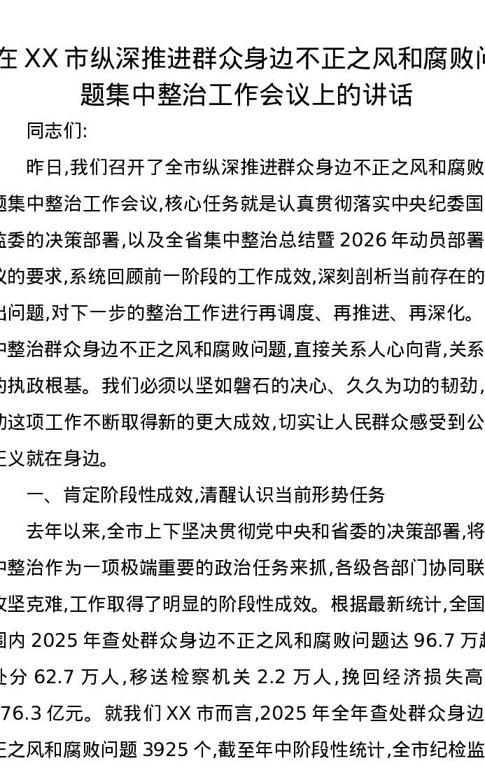 在XX市纵深推进群众身边不正之风和腐败问题集中整治工作会议上的讲话2