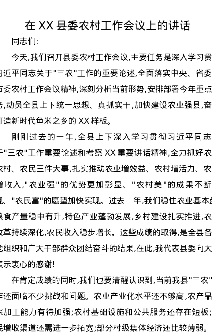 在XX县委农村工作会议上的讲话2