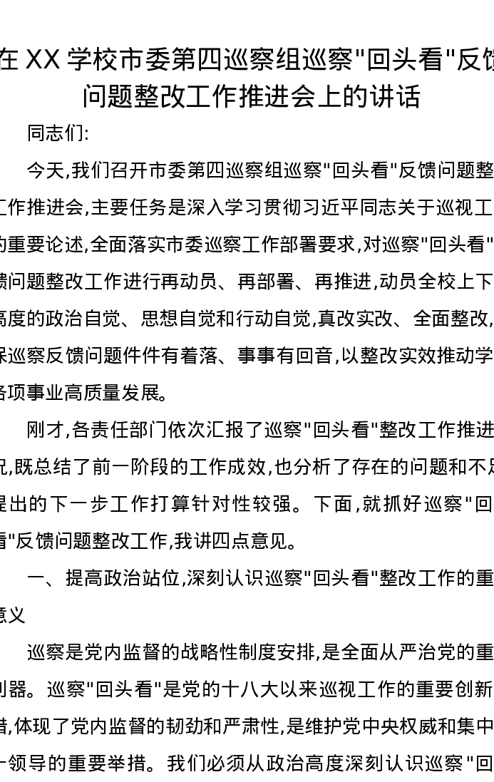 在XX学校市委第四巡察组巡察回头看反馈问题整改工作推进会上的讲话