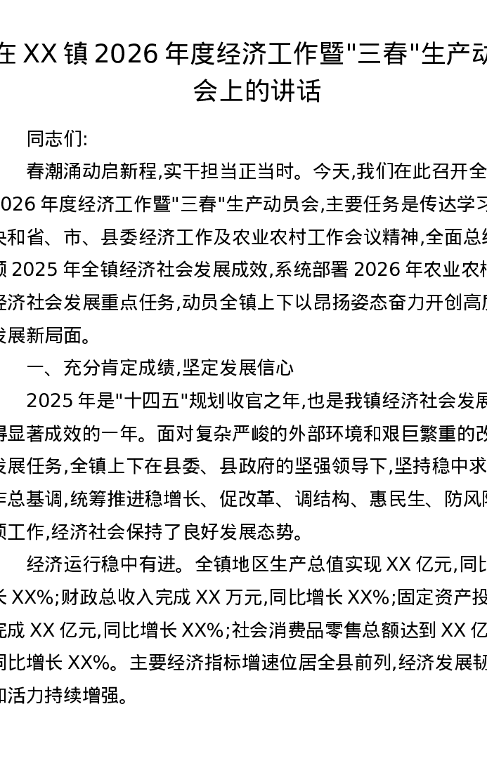 在XX镇2026年度经济工作暨三春生产动员会上的讲话