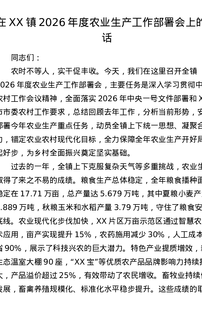 在XX镇2026年度农业生产工作部署会上的讲话