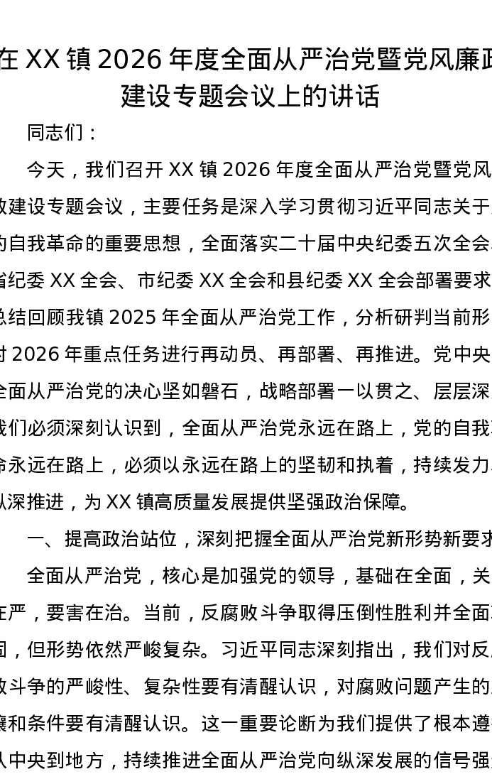 在XX镇2026年度全面从严治党暨党风廉政建设专题会议上的讲话