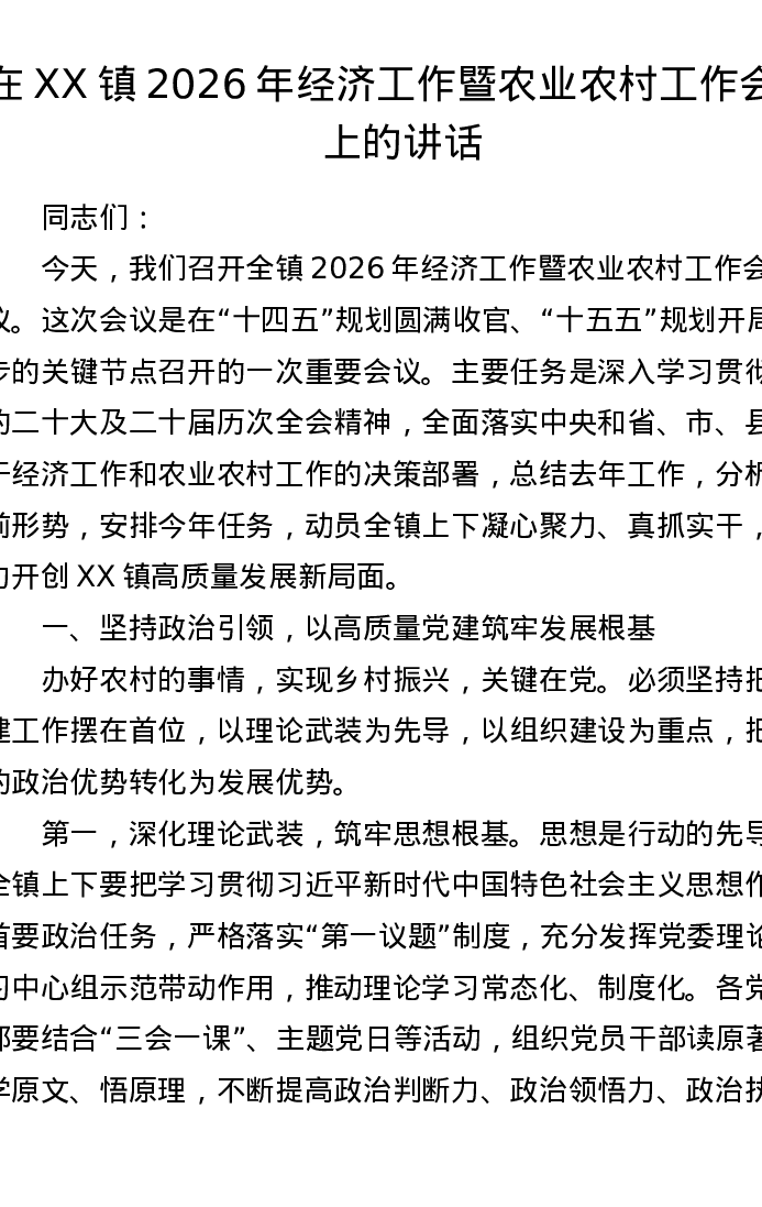 在XX镇2026年经济工作暨农业农村工作会议上的讲话