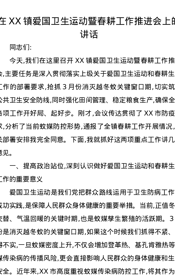 在XX镇爱国卫生运动暨春耕工作推进会上的讲话