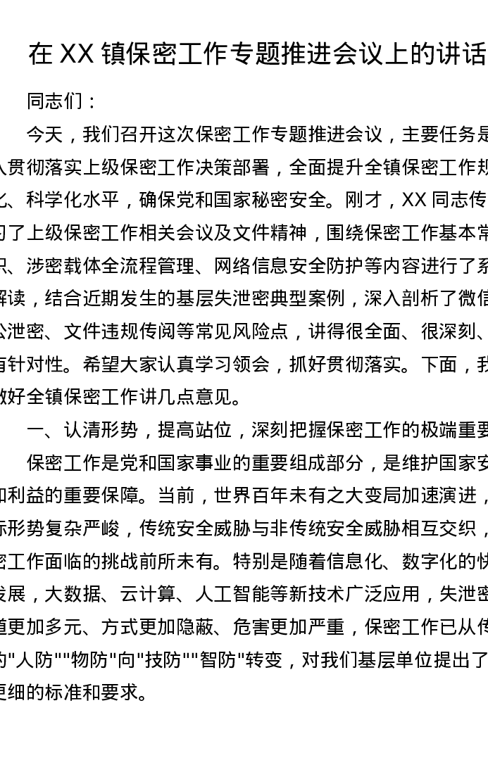 在XX镇保密工作专题推进会议上的讲话