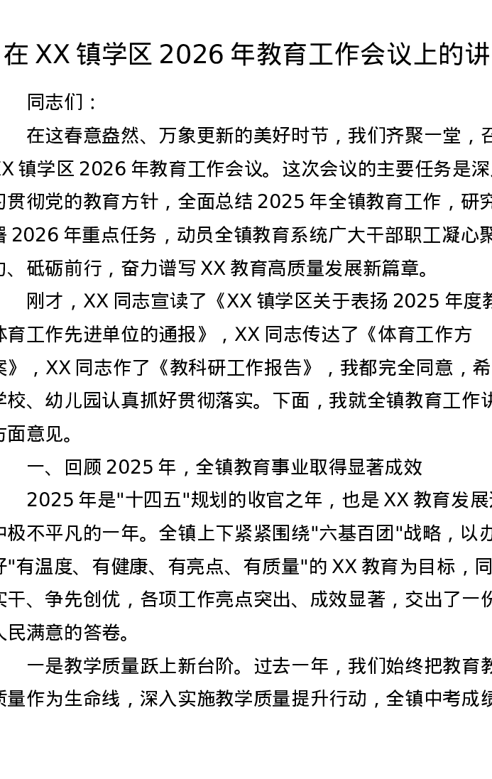 在XX镇学区2026年教育工作会议上的讲话