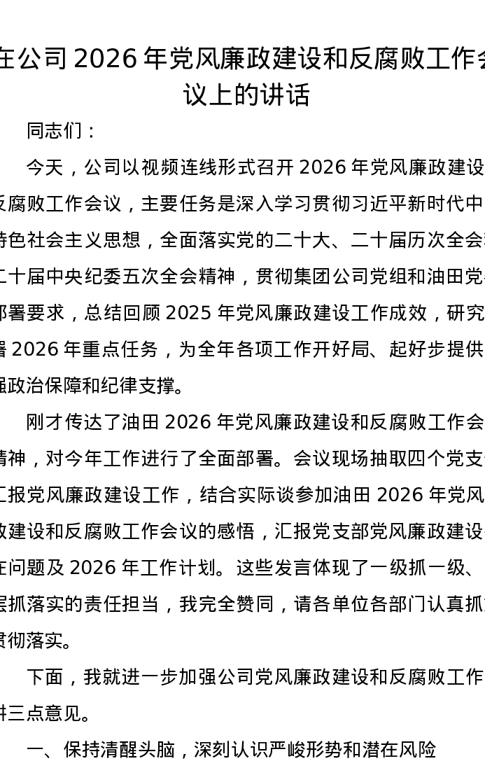在公司2026年党风廉政建设和反腐败工作会议上的讲话