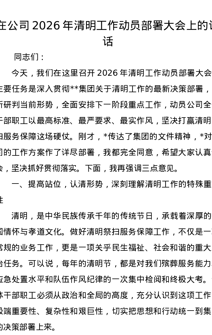 在公司2026年清明工作动员部署大会上的讲话