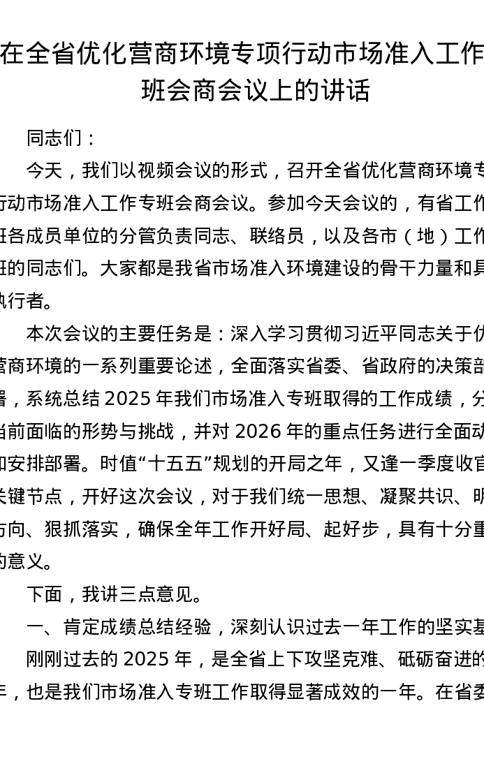在全省优化营商环境专项行动市场准入工作专班会商会议上的讲话