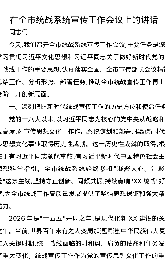 在全市统战系统宣传工作会议上的讲话