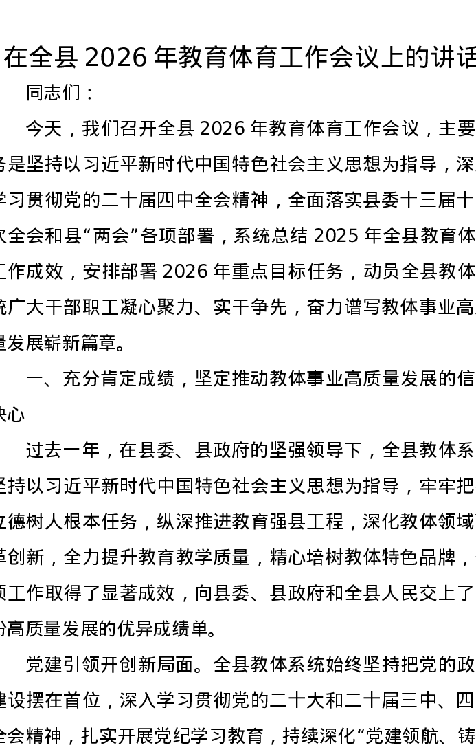 在全县2026年教育体育工作会议上的讲话