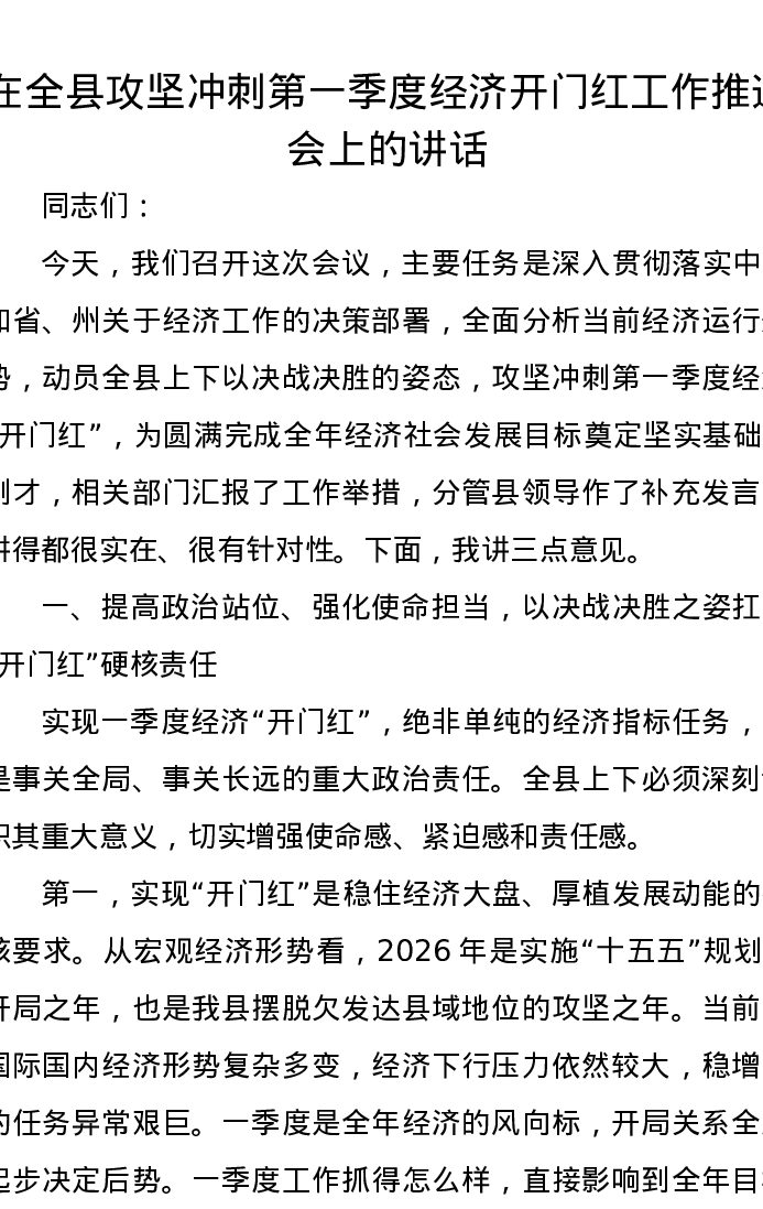 在全县攻坚冲刺第一季度经济开门红工作推进会上的讲话