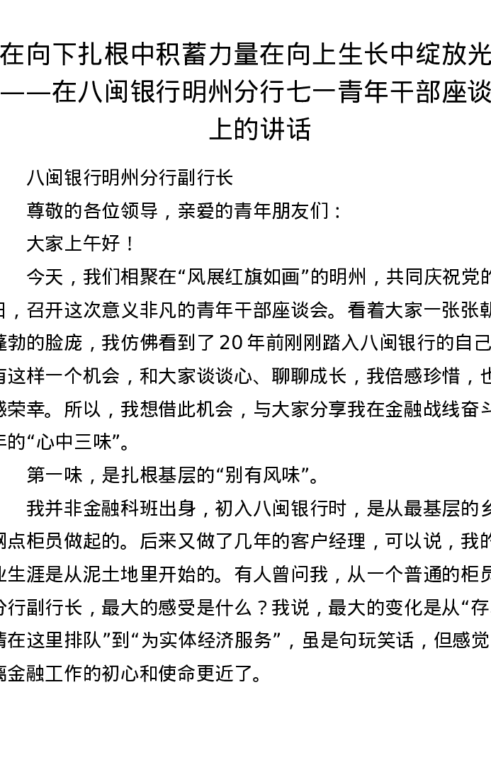在向下扎根中积蓄力量 在向上生长中绽放光芒——在八闽银行明州分行七一青年干部座谈会上的讲话