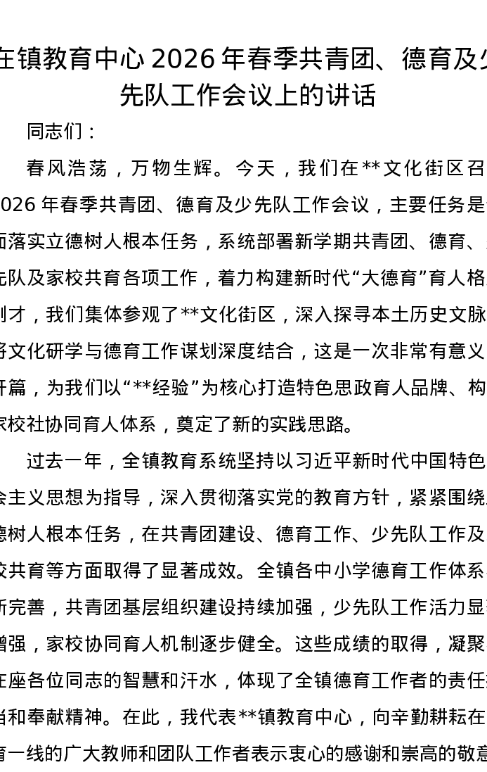在镇教育中心2026年春季共青团、德育及少先队工作会议上的讲话