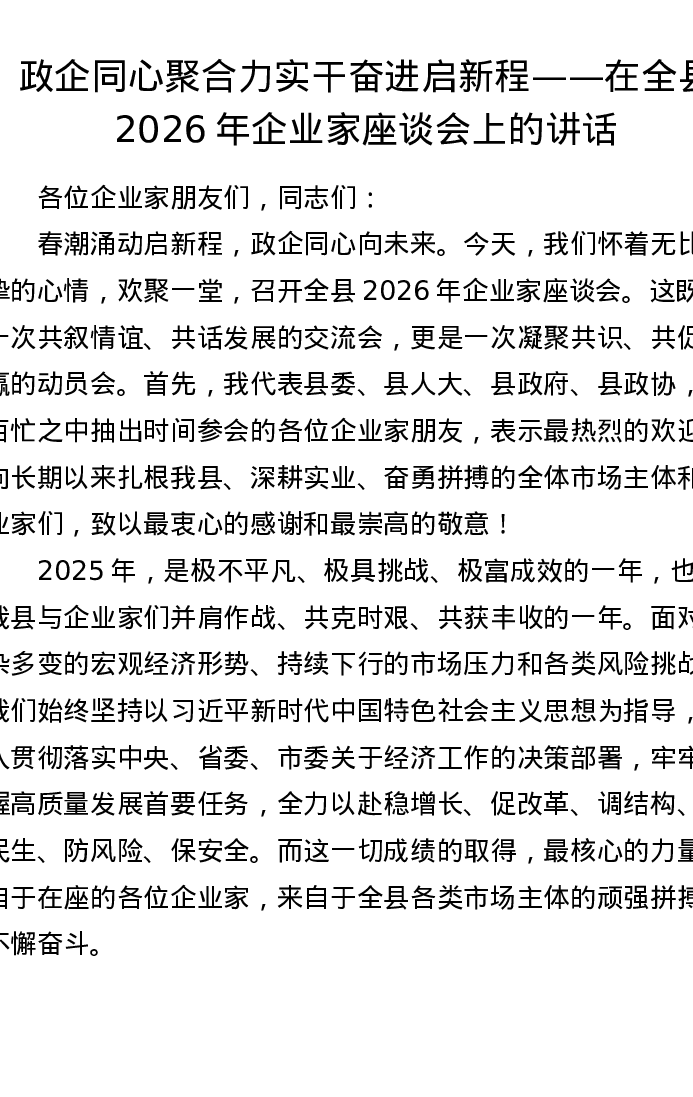 政企同心聚合力 实干奋进启新程——在全县2026年企业家座谈会上的讲话