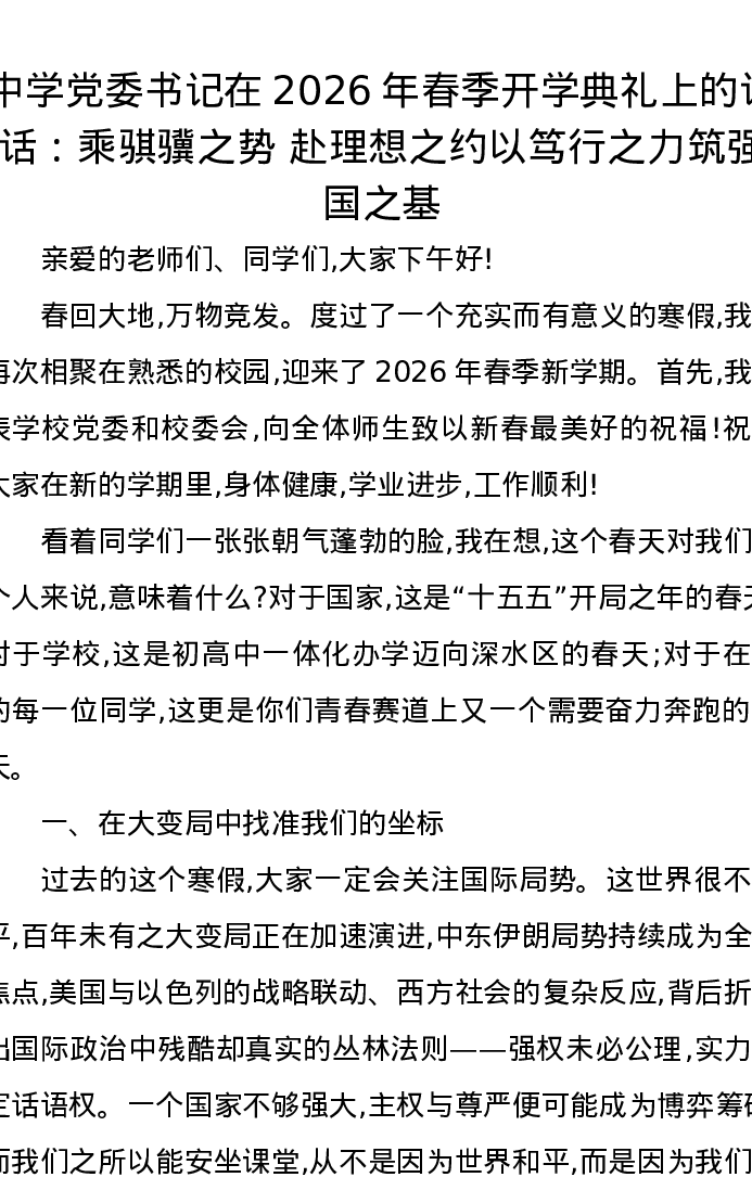 中学党委书记在2026年春季开学典礼上的讲话:乘骐骥之势 赴理想之约以笃行之力筑强国之基