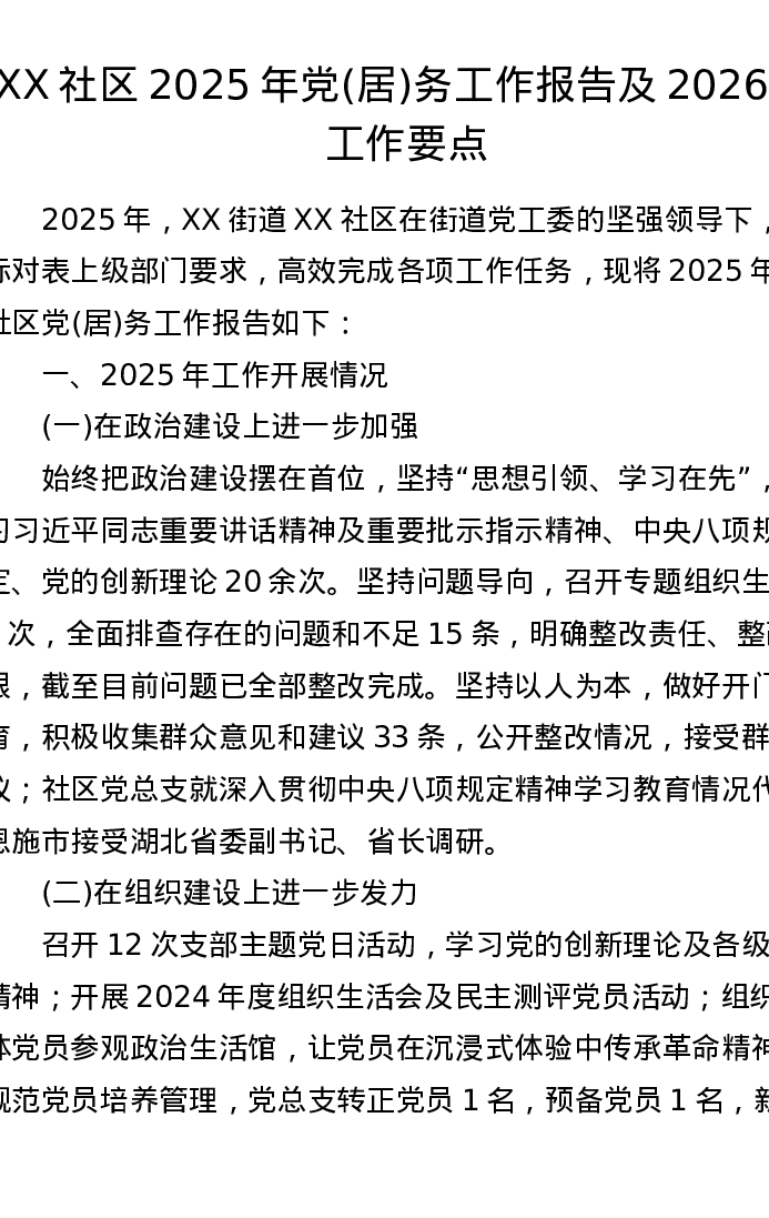 XX 社区 2025 年党 (居) 务工作报告及 2026 年工作要点