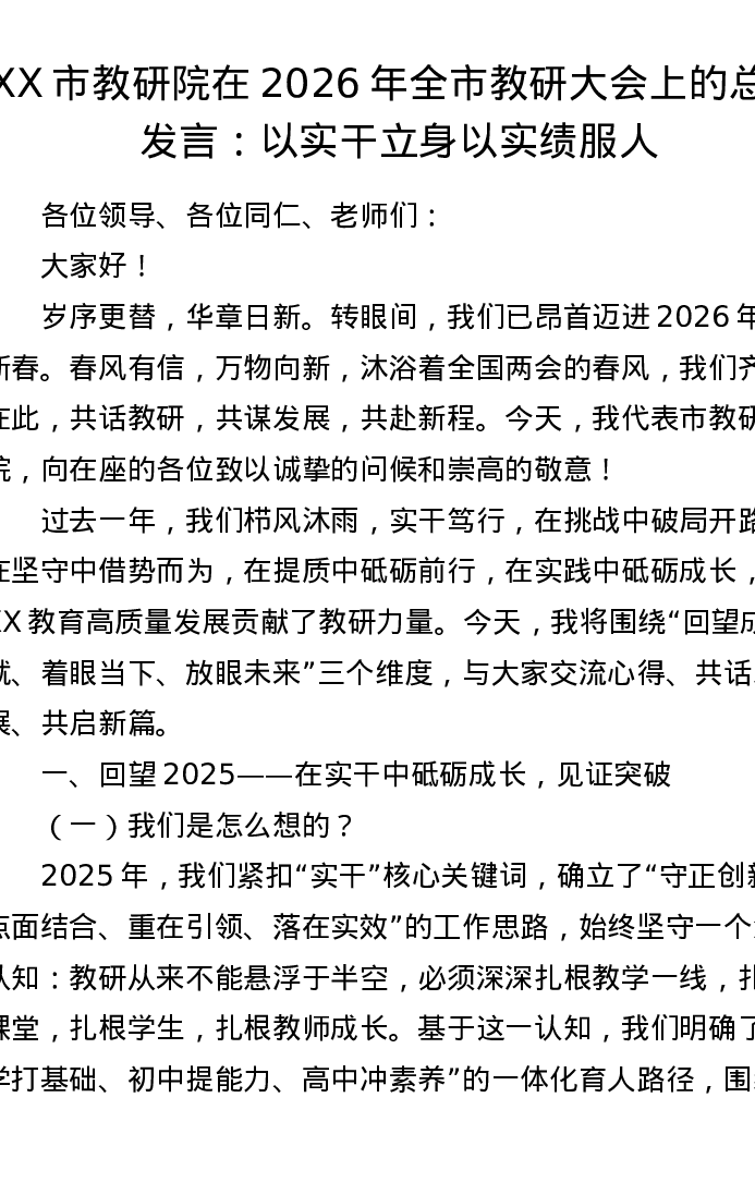 XX 市教研院在 2026 年全市教研大会上的总结发言:以实干立身 以实绩服人
