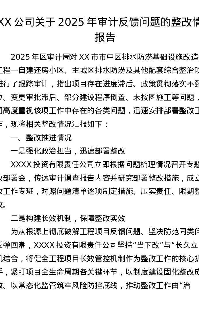 XX公司关于2025年审计反馈问题的整改情况报告