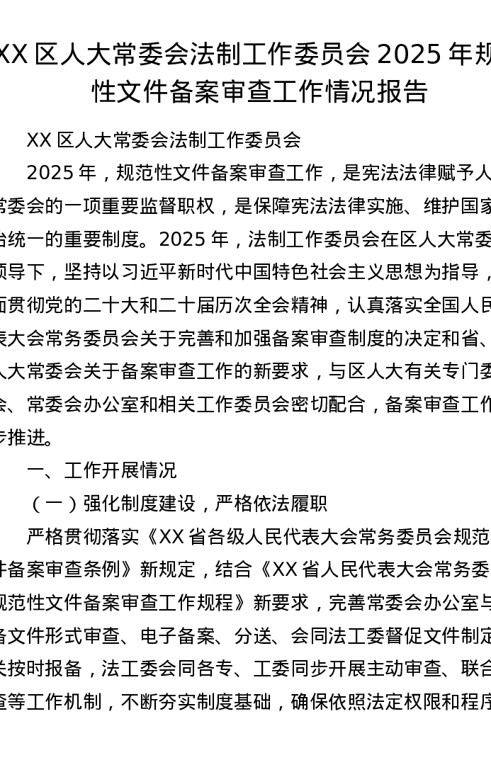 XX区人大常委会法制工作委员会 2025 年规范性文件备案审查工作情况报告