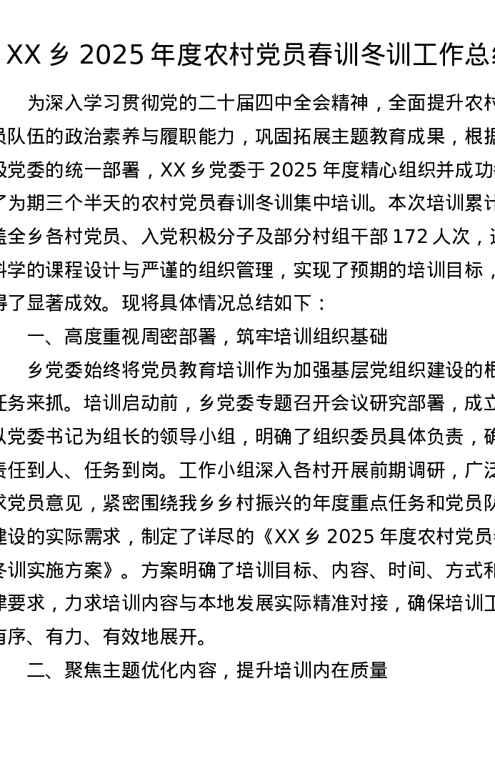 XX乡2025年度农村党员春训冬训工作总结