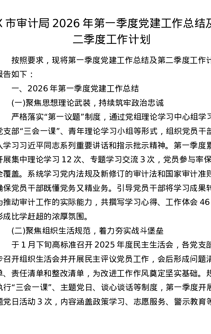 X市审计局2026 年第一季度党建工作总结及第二季度工作计划