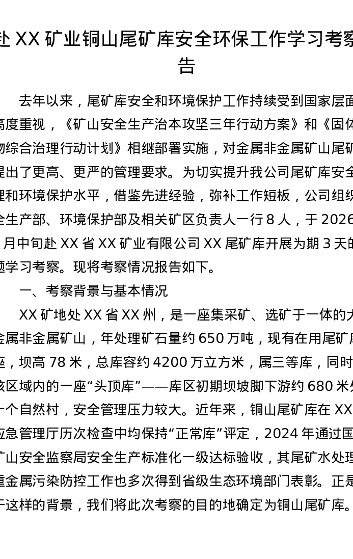 赴XX矿业铜山尾矿库安全环保工作学习考察报告