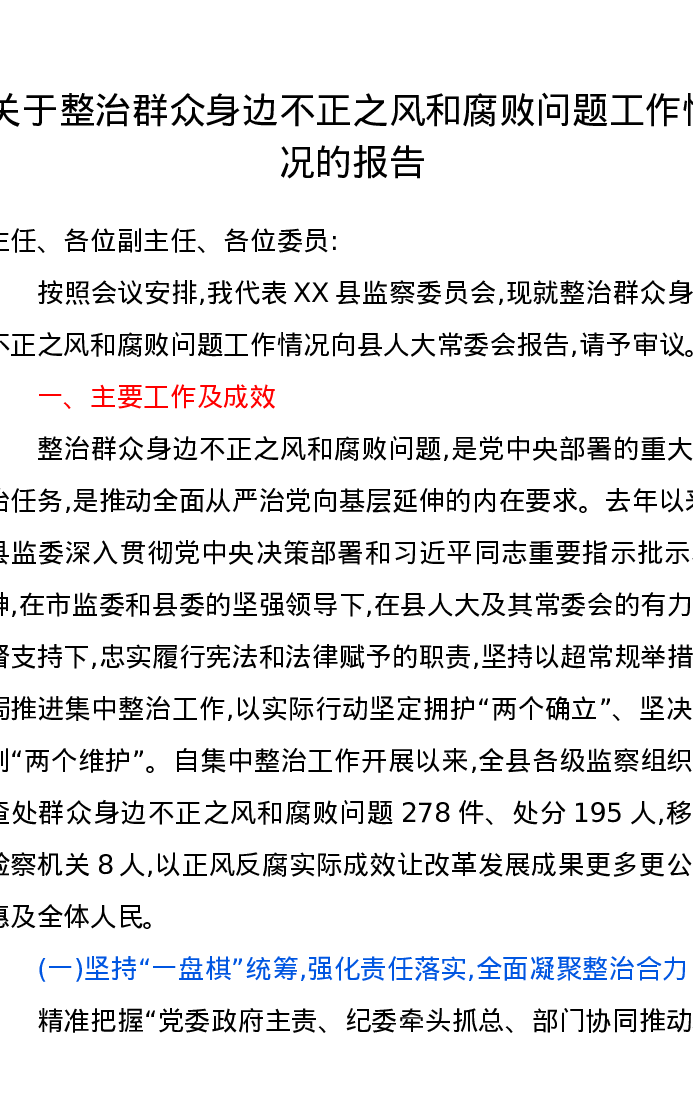 关于整治群众身边不正之风和腐败问题工作情况的报告