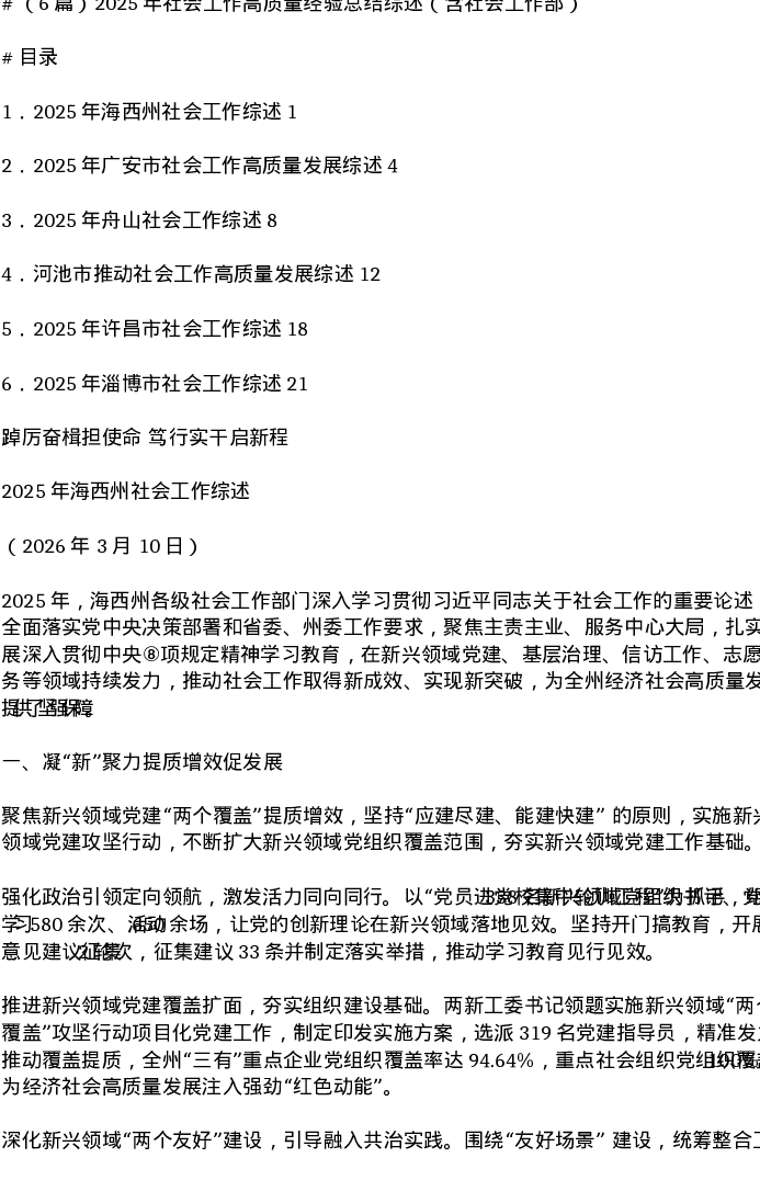 汇编:2025年社会工作高质量经验总结综述(含社会工作部)6篇