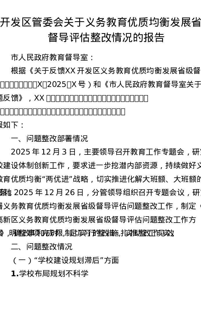 开发区管委会关于义务教育优质均衡发展省级督导评估整改情况的报告