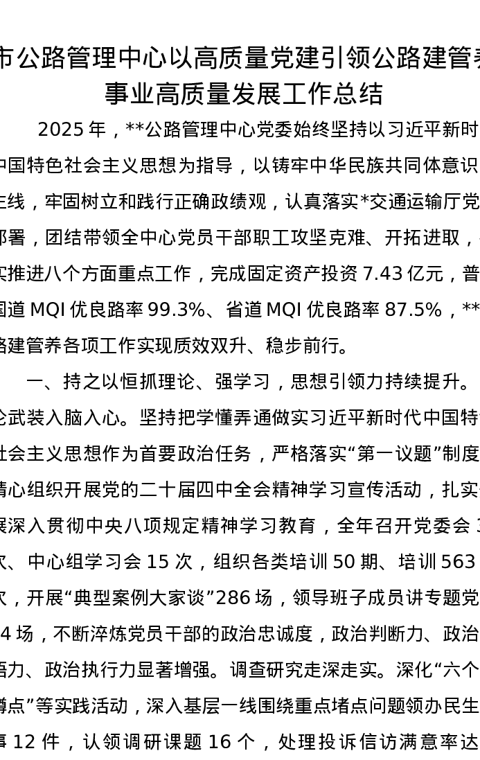 市公路管理中心以高质量党建引领公路建管养事业高质量发展工作总结