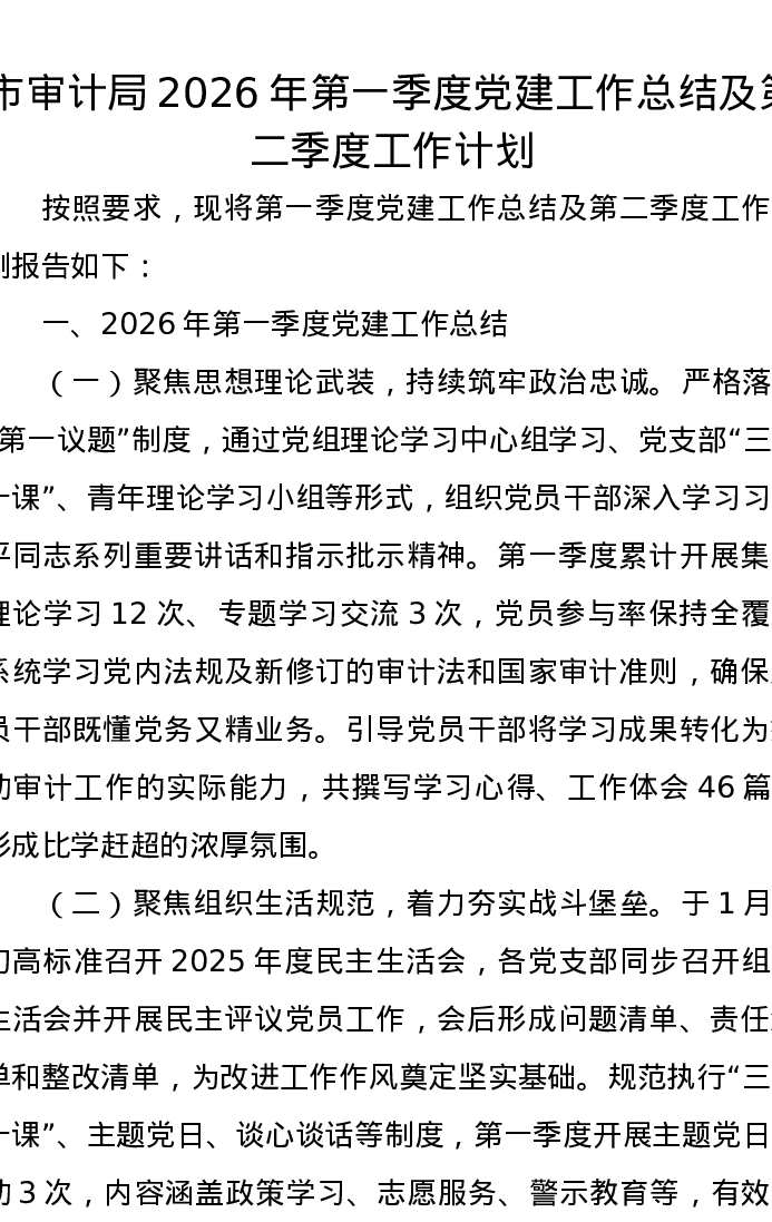 市审计局2026年第一季度党建工作总结及第二季度工作计划