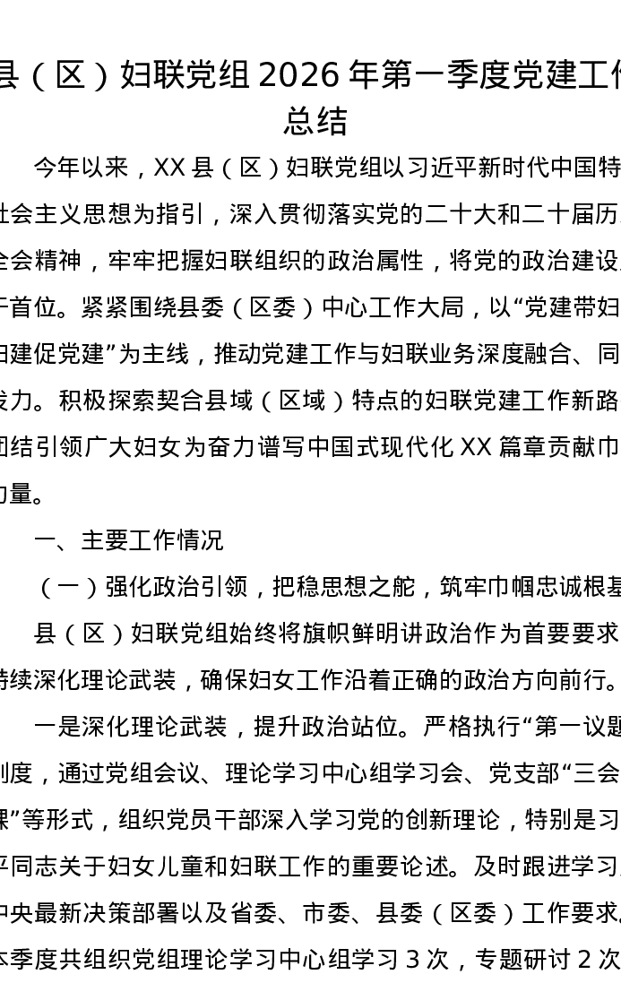 县(区)妇联党组2026年第一季度党建工作总结