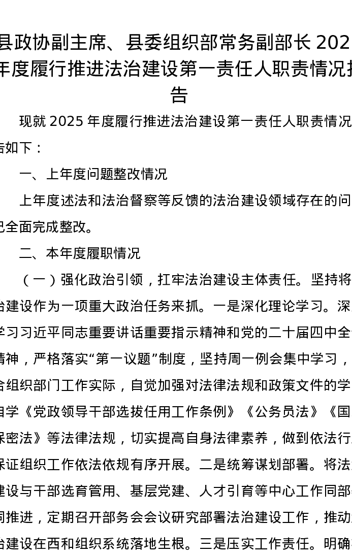 县政协副主席、县委组织部常务副部长2025年度履行推进法治建设第一责任人职责情况报告