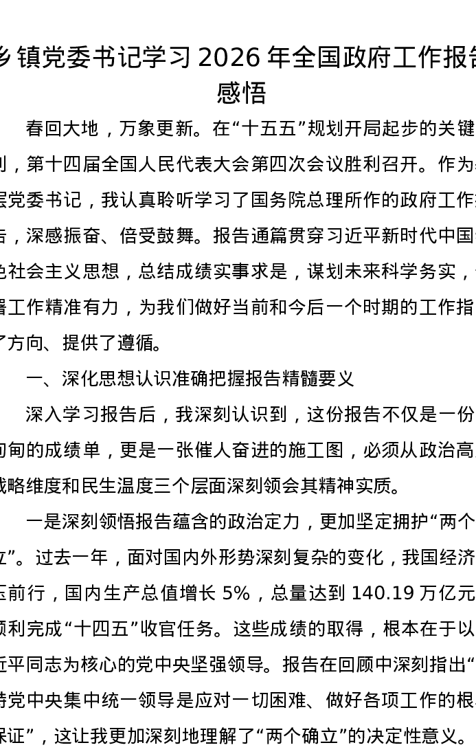 乡镇党委书记学习2026年全国政府工作报告感悟