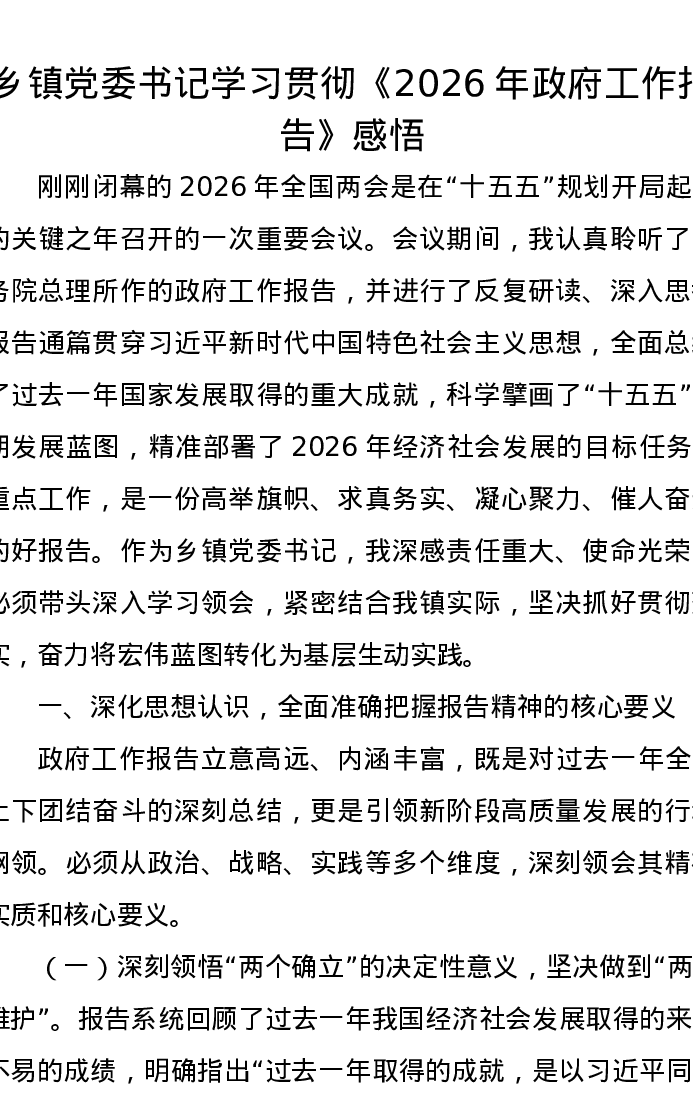 乡镇党委书记学习贯彻《2026年政府工作报告》感悟心得