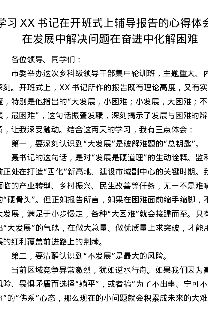 学习XX书记在开班式上辅导报告的心得体会:在发展中解决问题在奋进中化解困难