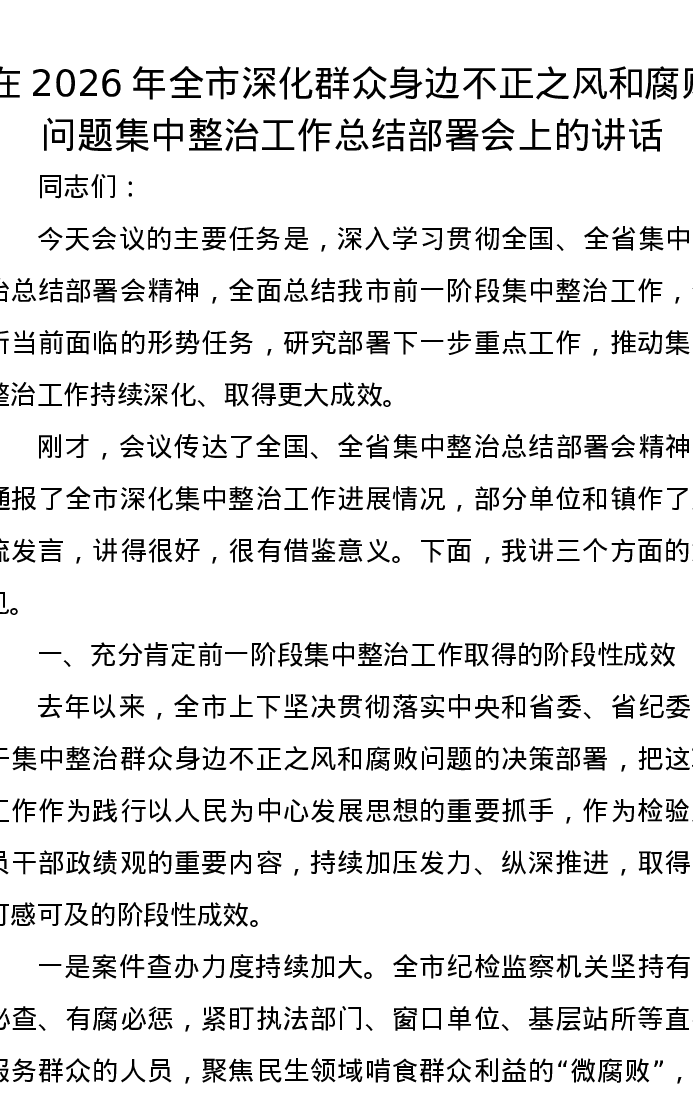 在2026年全市深化群众身边不正之风和腐败问题集中整治工作总结部署会上的讲话