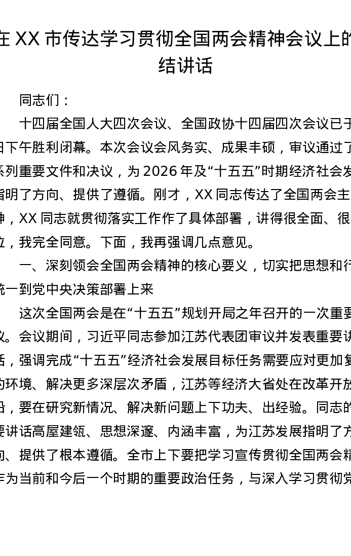 在XX市传达学习贯彻全国两会精神会议上的总结讲话