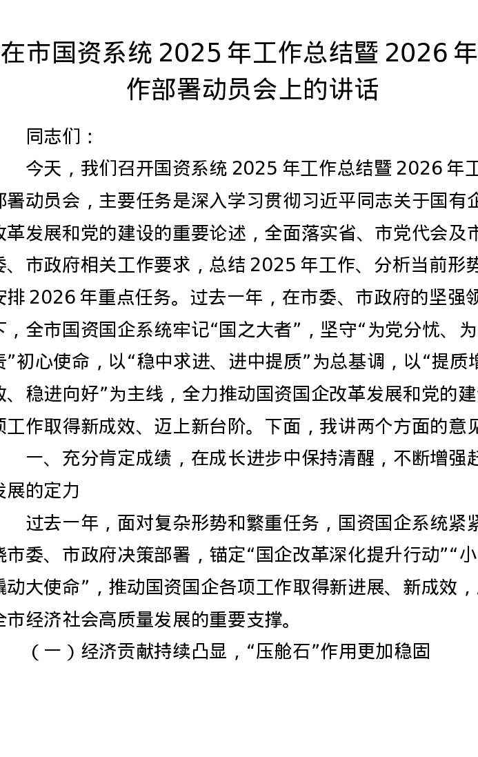在市国资系统2025年工作总结暨2026年工作部署动员会上的讲话