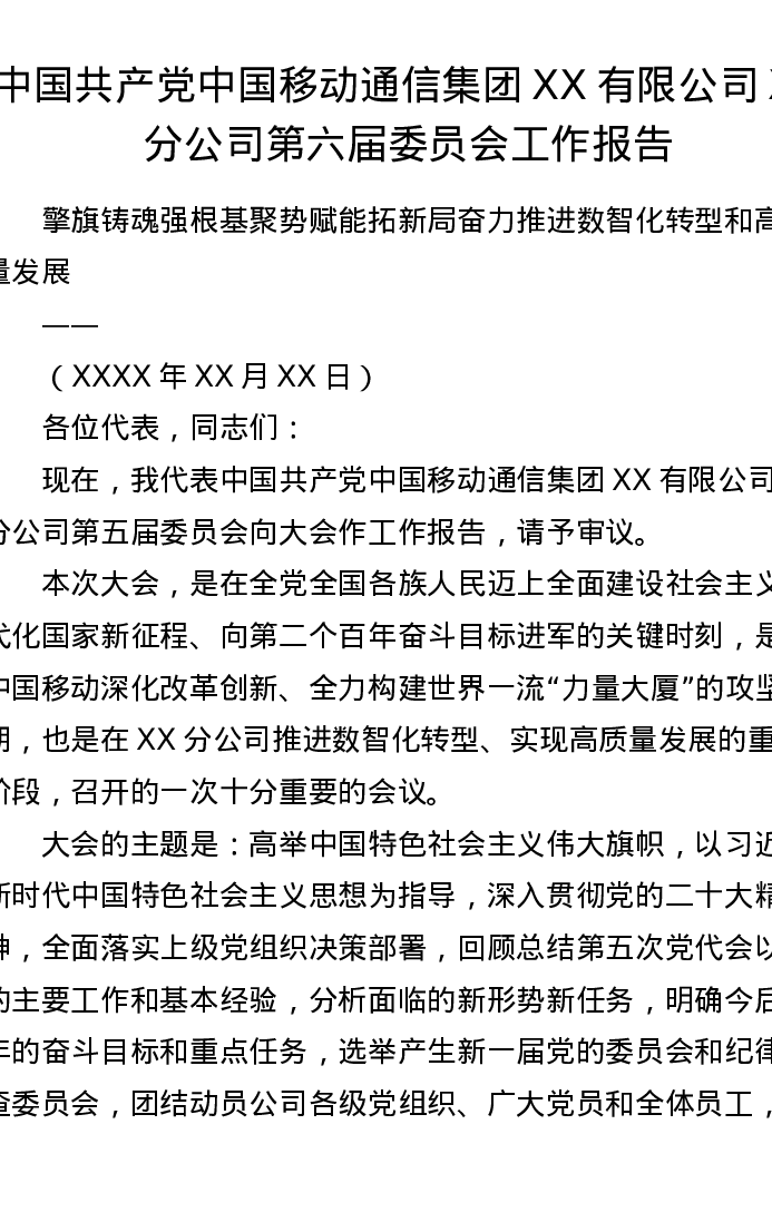 中国共产党中国移动通信集团XX有限公司XX分公司第六届委员会工作报告