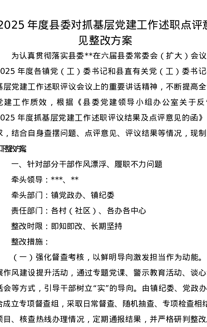 2025年度县委对抓基层党建工作述职点评意见整改方案