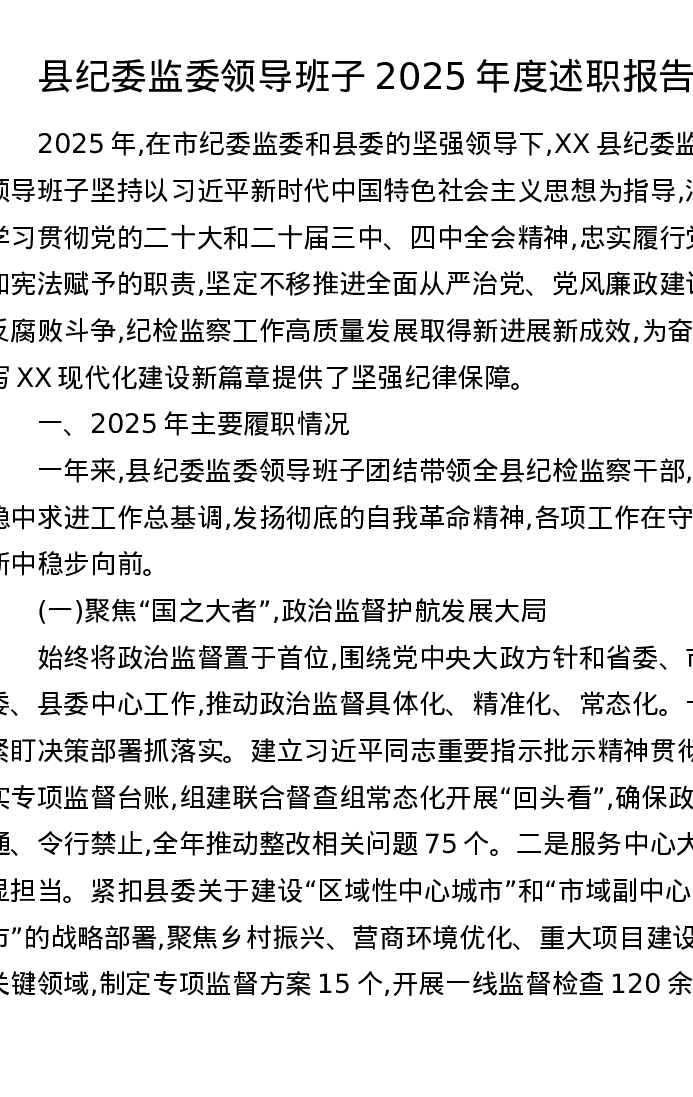 县纪委监委领导班子2025年度述职报告