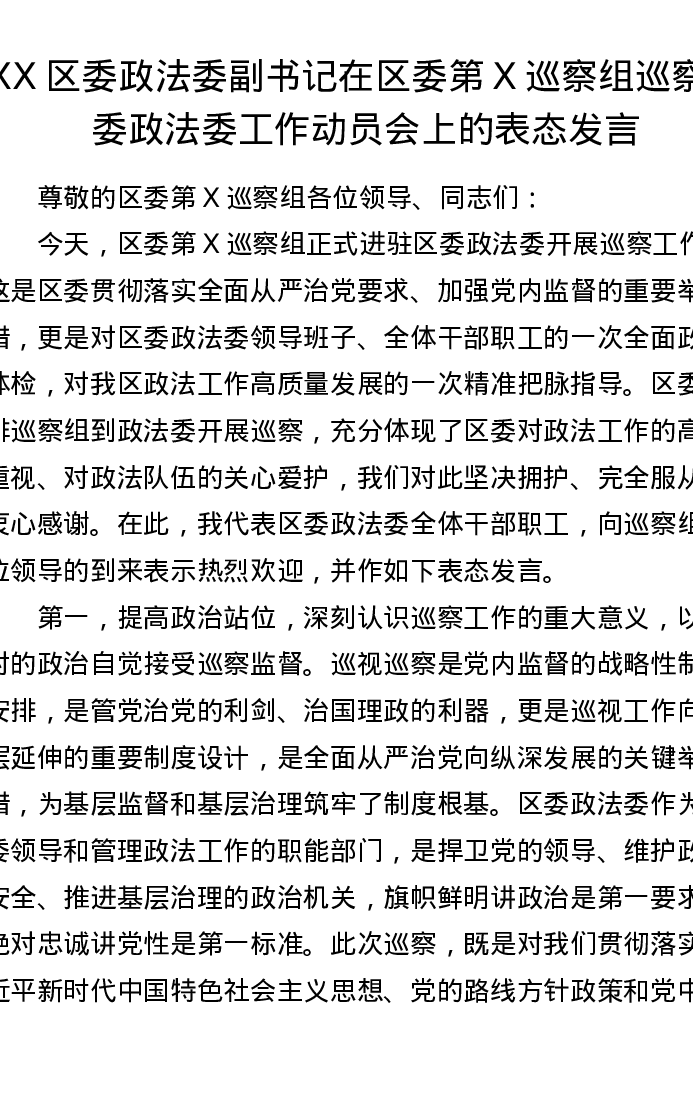 XX区委政法委副书记在区委第X巡察组巡察区委政法委工作动员会上的表态发言2