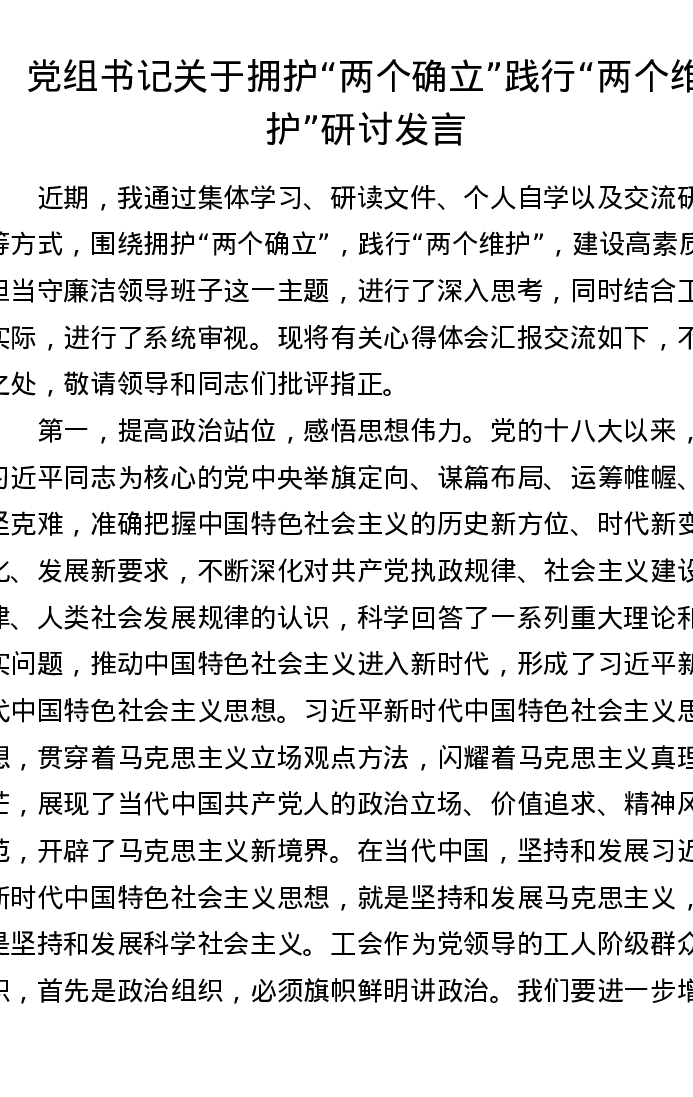 党组书记关于拥护两个确立践行两个维护研讨发言
