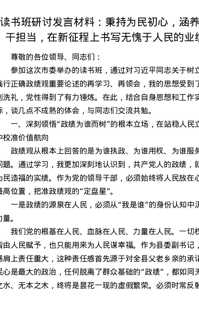读书班研讨发言材料:秉持为民初心,涵养实干担当,在新征程上书写无愧于人民的业绩
