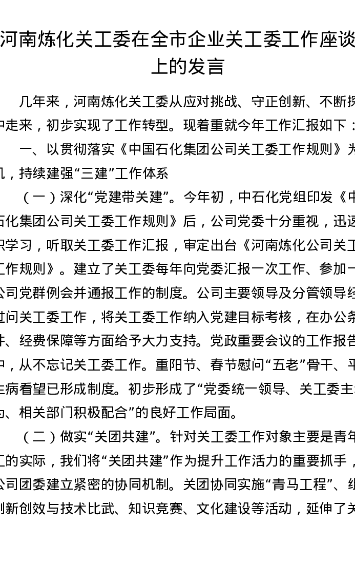河南炼化关工委在全市企业关工委工作座谈会上的发言