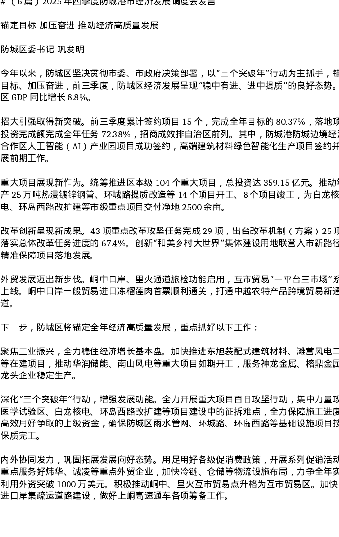 汇编:2025年四季度防城港市经济发展调度会发言6篇