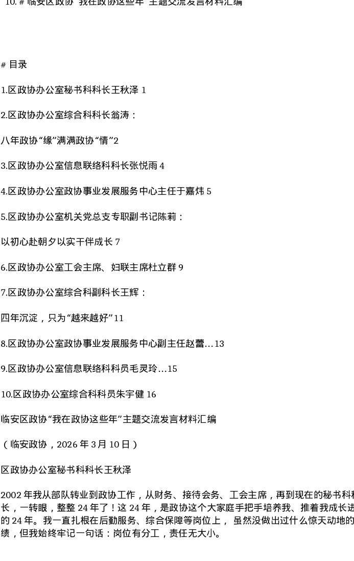 汇编:临安区政协我在政协这些年主题交流发言10篇